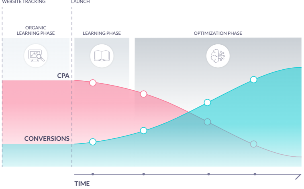 During the learning phase, the goal is to teach our AI which tactics will work best for your particular campaign. This is done through broad targeting to gain insights on which websites and visitors are most likely to generate conversions for your products.